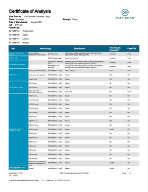 Mango Ingredients: Sugar, Light Corn Syrup, Pectin, Natural Mango Flavor, Cannabidiol (From Hemp Extract), Citric Acid, Baking Soda, Water.